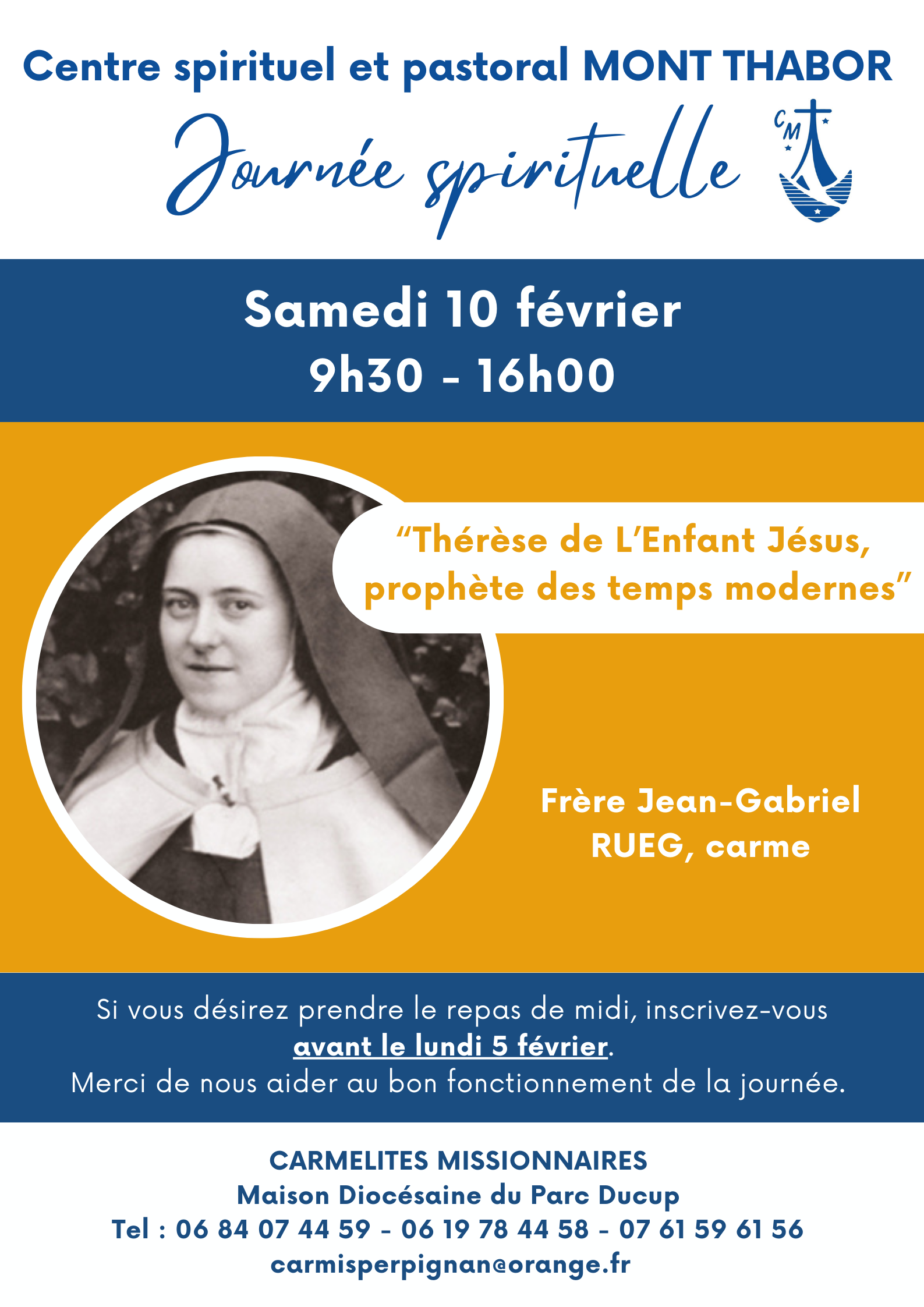 Samedi 10 février, de 09:30 à 16:00, en la maison diocésaine du Parc Ducup de Perpignan, le Centre Spirituel et Pastoral du Mont Thabor reçoit le frère Jean-Gabriel RUEG, carme, lors d'une journée de conférence autour de "Thérèse de l'Enfant Jésus, Prophète des temps modernes"... Retrouvez ici une des précédentes conférences de frère Jean-Gabriel sur le thème de "L'heure de la rencontre avec Dieu" ...