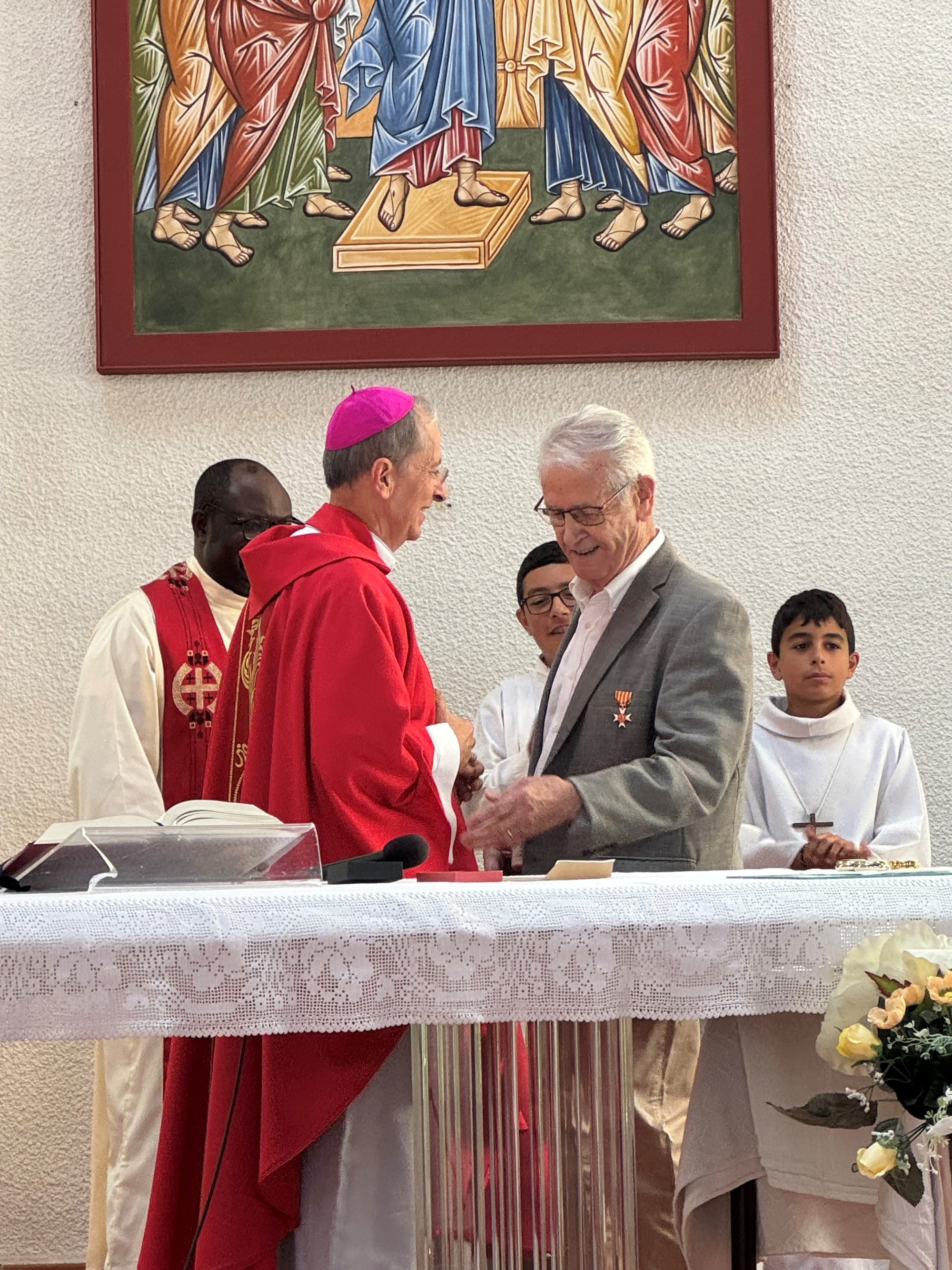 En clôture de cette messe, Pierre Teisseyre a reçu la médaille du Mérite diocésain des mains de Mgr Scherrer. L’évêque a salué son engagement en le décrivant comme « parmi ces chrétiens qui ne font pas de bruit et qui sont des chrétiens merveilleux ». Pendant 15 ans, il a assuré avec fidélité et un grand sens du service la fonction de comptable de la communauté de paroisses de la Sainte-Famille.