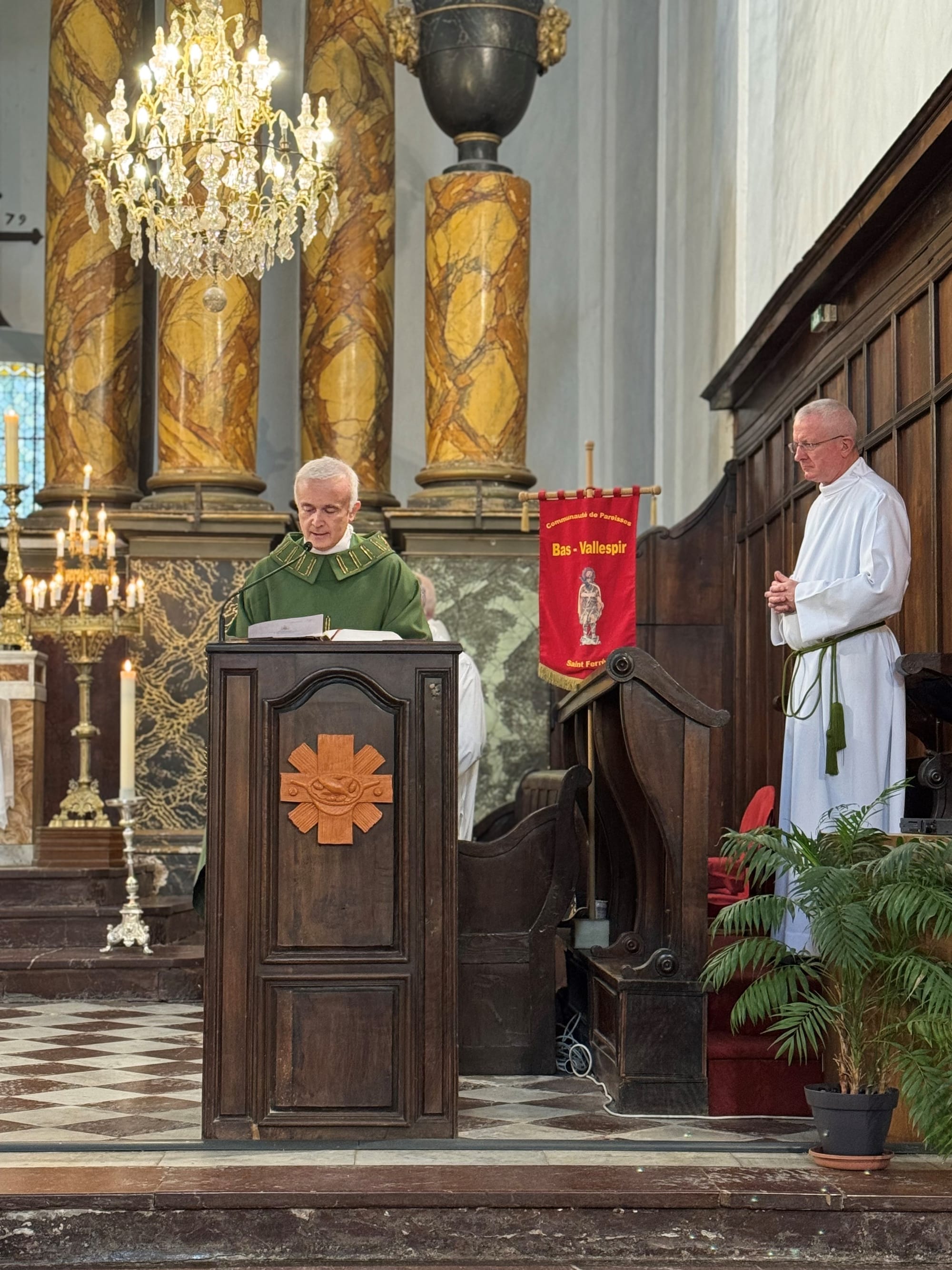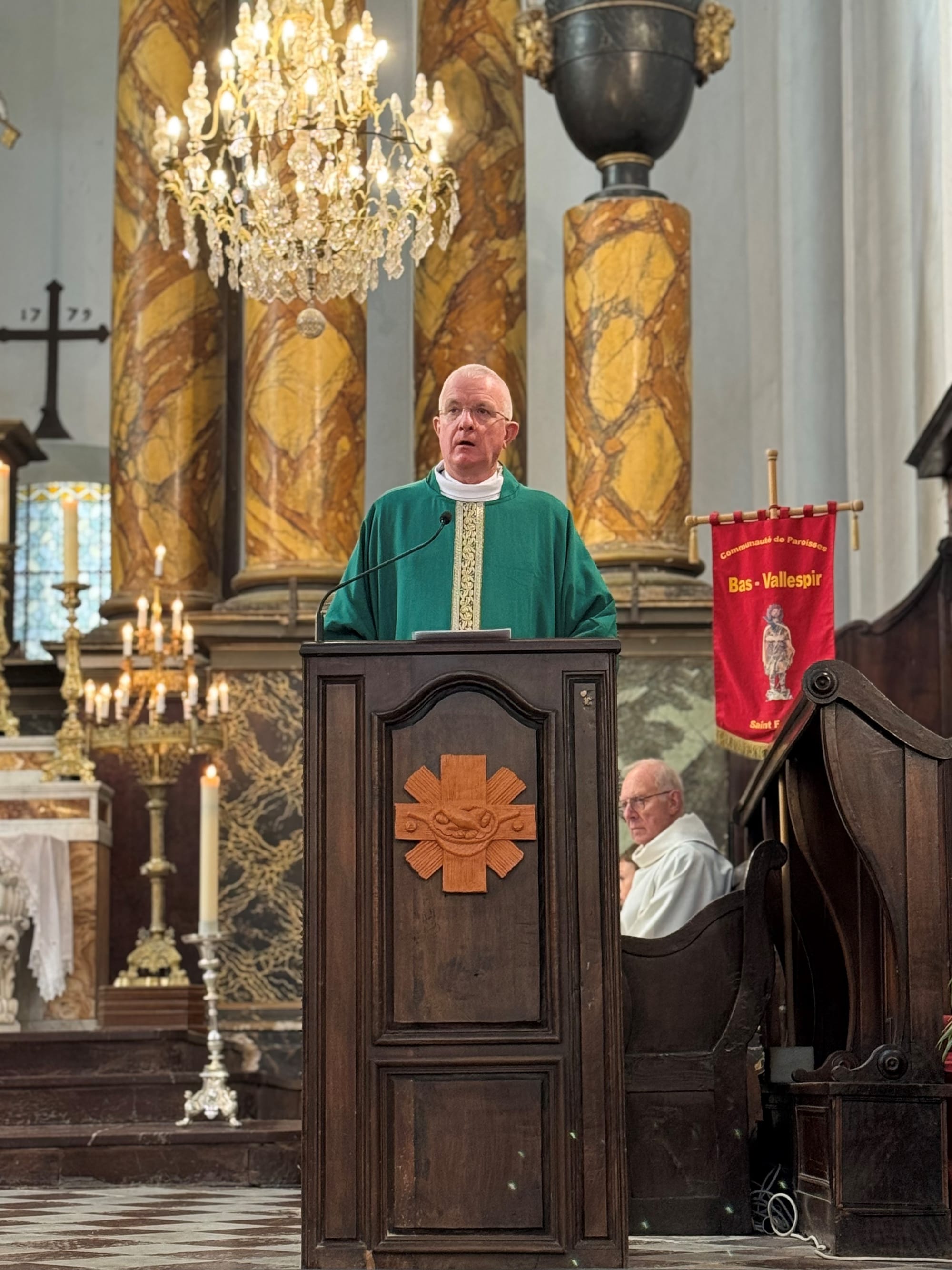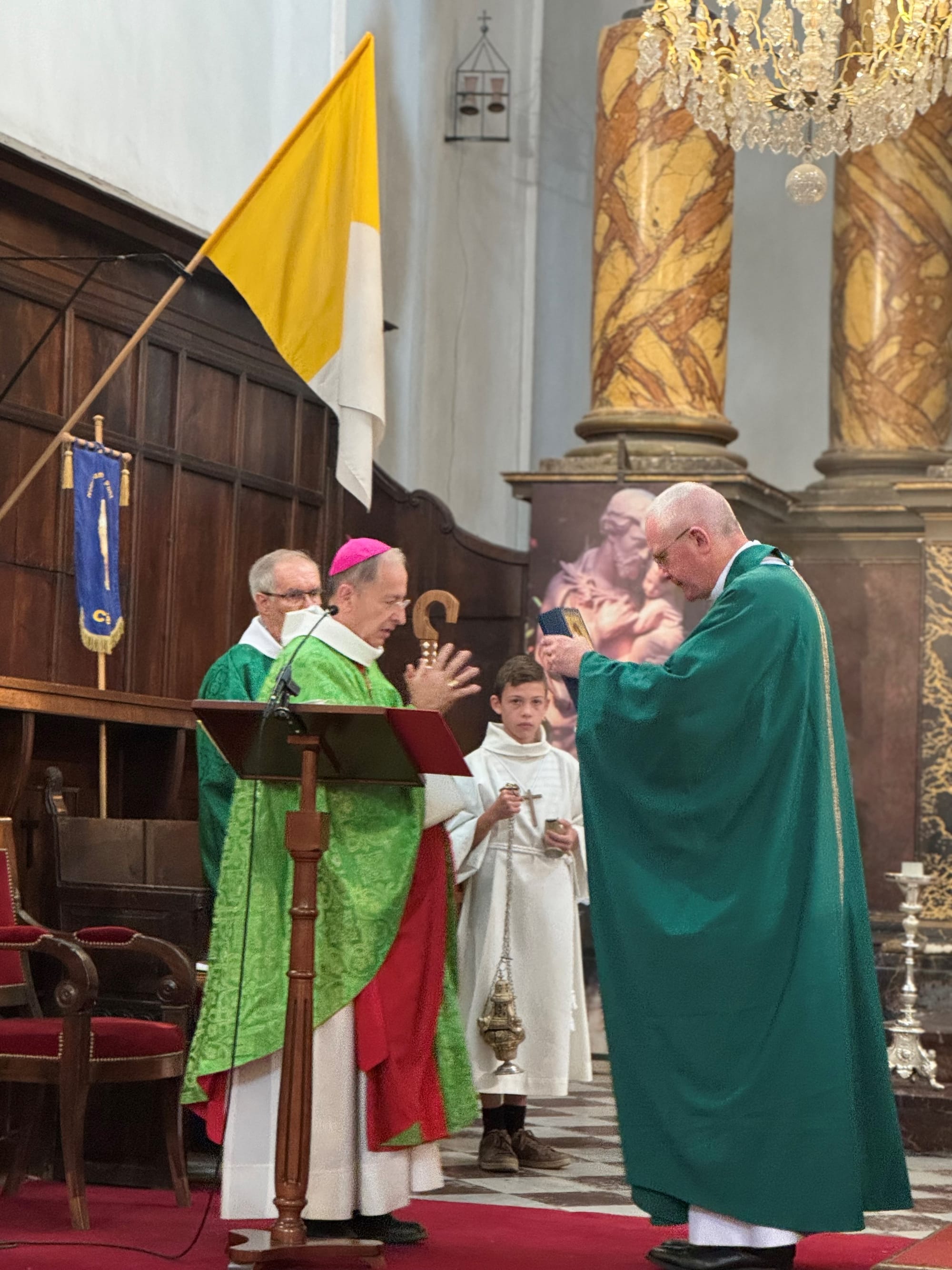 Cher Olivier, je reprends volontiers pour vous les mots de l'apôtre Paul à son disciple Timothée : « Le Seigneur m'a assisté. Il m'a rempli de force pour que, par moi, la proclamation de l'évangile s'accomplisse jusqu'au bout et que toutes les nations l'entendent ». En ce jour où vous êtes officiellement investi de la charge curiale, solidairement avec votre frère, le Père Bavon, accueillez cet encouragement de l’apôtre. Votre mission pastorale ne part pas de rien ; elle s'inscrit dans l'héritage des ministères accomplis par les prêtres qui vous ont précédés, spécialement, le Père Étienne Lafaye et le Père Pierre Téqui. Les prêtres se suivent et ne se ressemblent pas. Aussi, j’ai bien conscience qu’accueillir de nouveaux visages de prêtres est toujours un défi pour la communauté paroissiale. Alors, merci, mes amis, d’accueillir le Père Olivier et de veiller à sa personne aux côtés du Père Bavon. Et merci à nos frères diacres, Georges de Massia et René Sors, de porter avec eux la charge pastorale sous le patronage de saint Ferréol, patron de cette belle communauté de paroisses. "