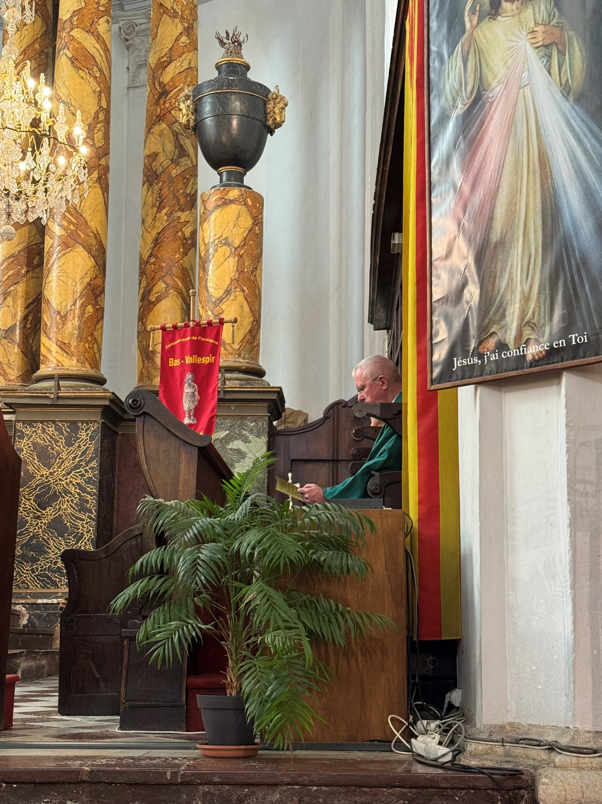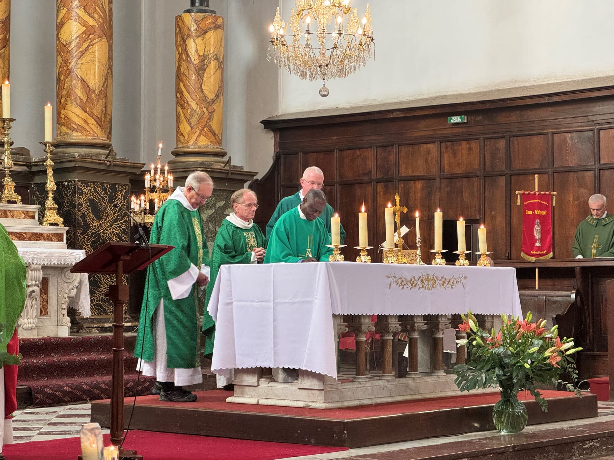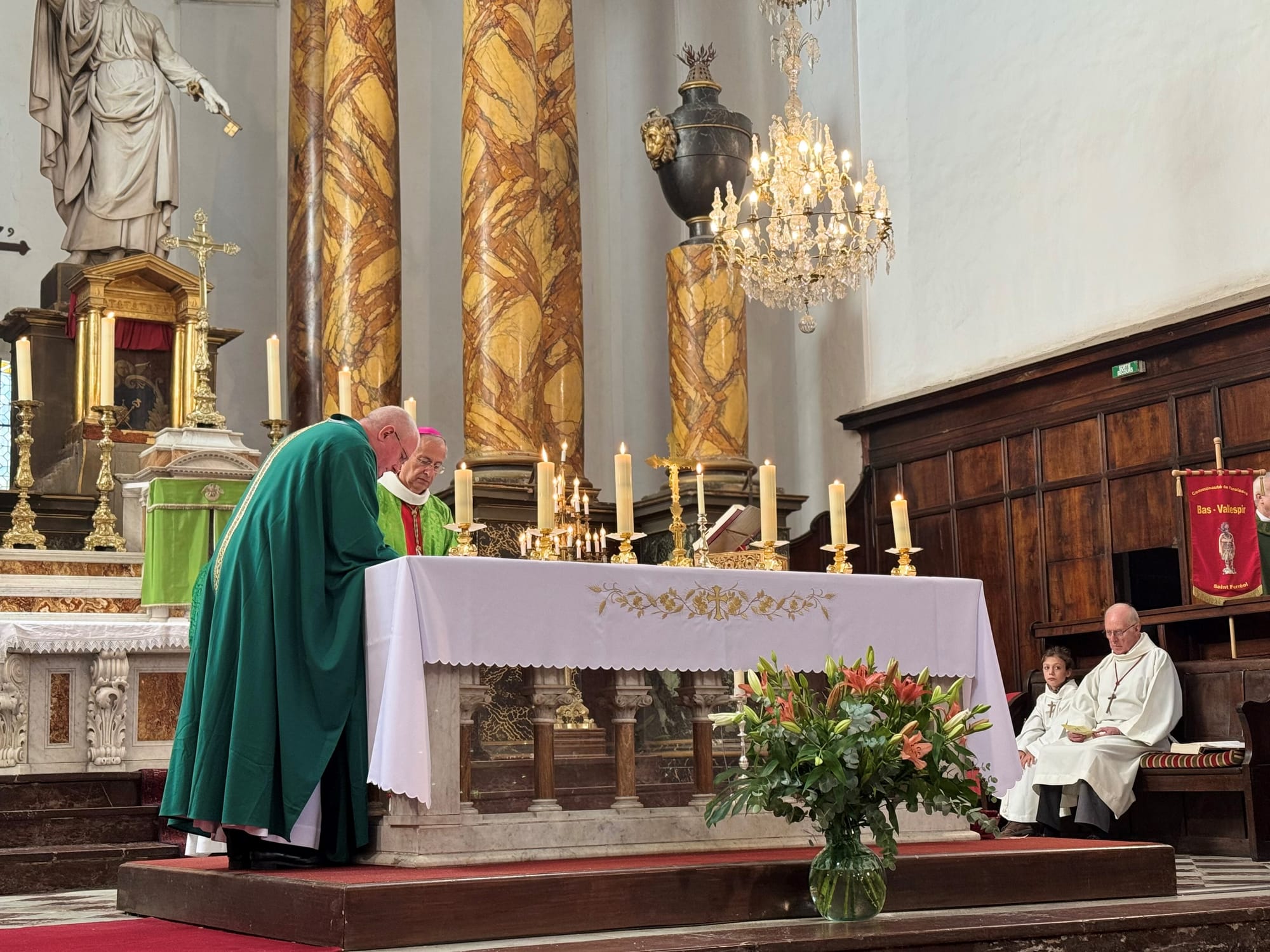 Cher Olivier, je reprends volontiers pour vous les mots de l'apôtre Paul à son disciple Timothée : « Le Seigneur m'a assisté. Il m'a rempli de force pour que, par moi, la proclamation de l'évangile s'accomplisse jusqu'au bout et que toutes les nations l'entendent ». En ce jour où vous êtes officiellement investi de la charge curiale, solidairement avec votre frère, le Père Bavon, accueillez cet encouragement de l’apôtre. Votre mission pastorale ne part pas de rien ; elle s'inscrit dans l'héritage des ministères accomplis par les prêtres qui vous ont précédés, spécialement, le Père Étienne Lafaye et le Père Pierre Téqui. Les prêtres se suivent et ne se ressemblent pas. Aussi, j’ai bien conscience qu’accueillir de nouveaux visages de prêtres est toujours un défi pour la communauté paroissiale. Alors, merci, mes amis, d’accueillir le Père Olivier et de veiller à sa personne aux côtés du Père Bavon. Et merci à nos frères diacres, Georges de Massia et René Sors, de porter avec eux la charge pastorale sous le patronage de saint Ferréol, patron de cette belle communauté de paroisses. "