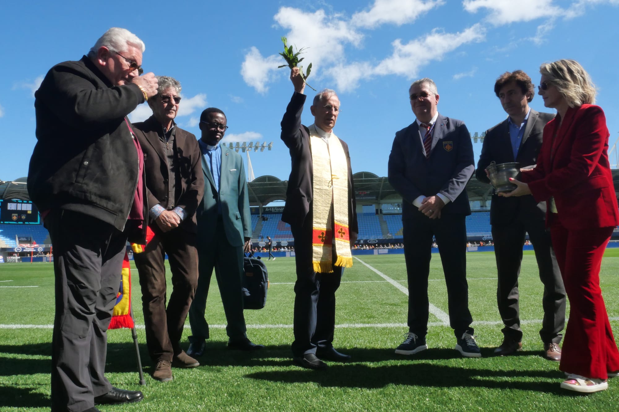 La pelouse, bénie avec des branches de laurier, a aussi accueilli des gestes de foi de la part de nombreux joueurs (des deux équipes) lors de leur entrée ou de leur sortie sur le terrain, pendant le match. Et sous les acclamations de la Furia Catalane, "la cathédrale" Aimé Giral (déjà qualifiée ainsi lors de son installation par notre Évèque) a vibré d'une fraternité et d'une communion de la plus belle des intensités. Encore merci aux joueurs des deux équipes pour leur magnifique "combat" et aux trois blessés de notre équipe, dont Posolo Tuilagui, vers lesquels nous orienterons aussi nos prochaines prières en vue de leur complet rétablissement.